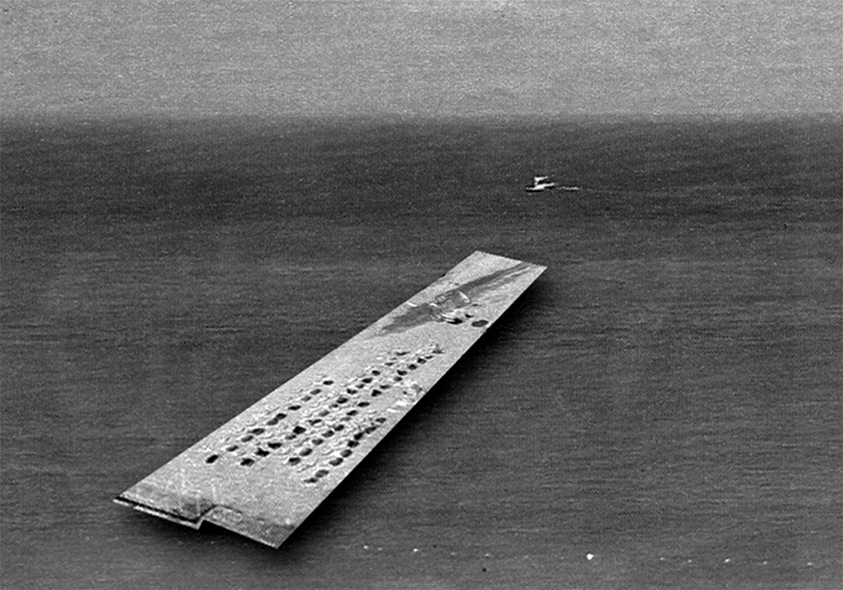 The work “Achille Lauro”, through its title, again takes up these aspects of security, collective and individual fear, and the common longing for pleasure, refreshment and fun. The work comprises a series of photo-montages of beach scenes set against an ocean backdrop, as if the beaches were freely drifting on the open sea. One can conclude from the rough screen pattern of the picture surfaces that the individual elements were enlarged. In fact both the beach details and the ocean photos were taken from found travel prospectuses. All sheets of this series are presented as black-and-white prints. Detached from their advertising context, the portions of beach appear as large floating bodies; their irregular rectangular shapes as well as the systematic arrangement of the depicted beach furniture make them look like aircraft carriers out on the sea. The collage technique isolates these beaches from their geographical and architectural contexts, and they thus turn into abstract shapes against a mostly monochrome background.
