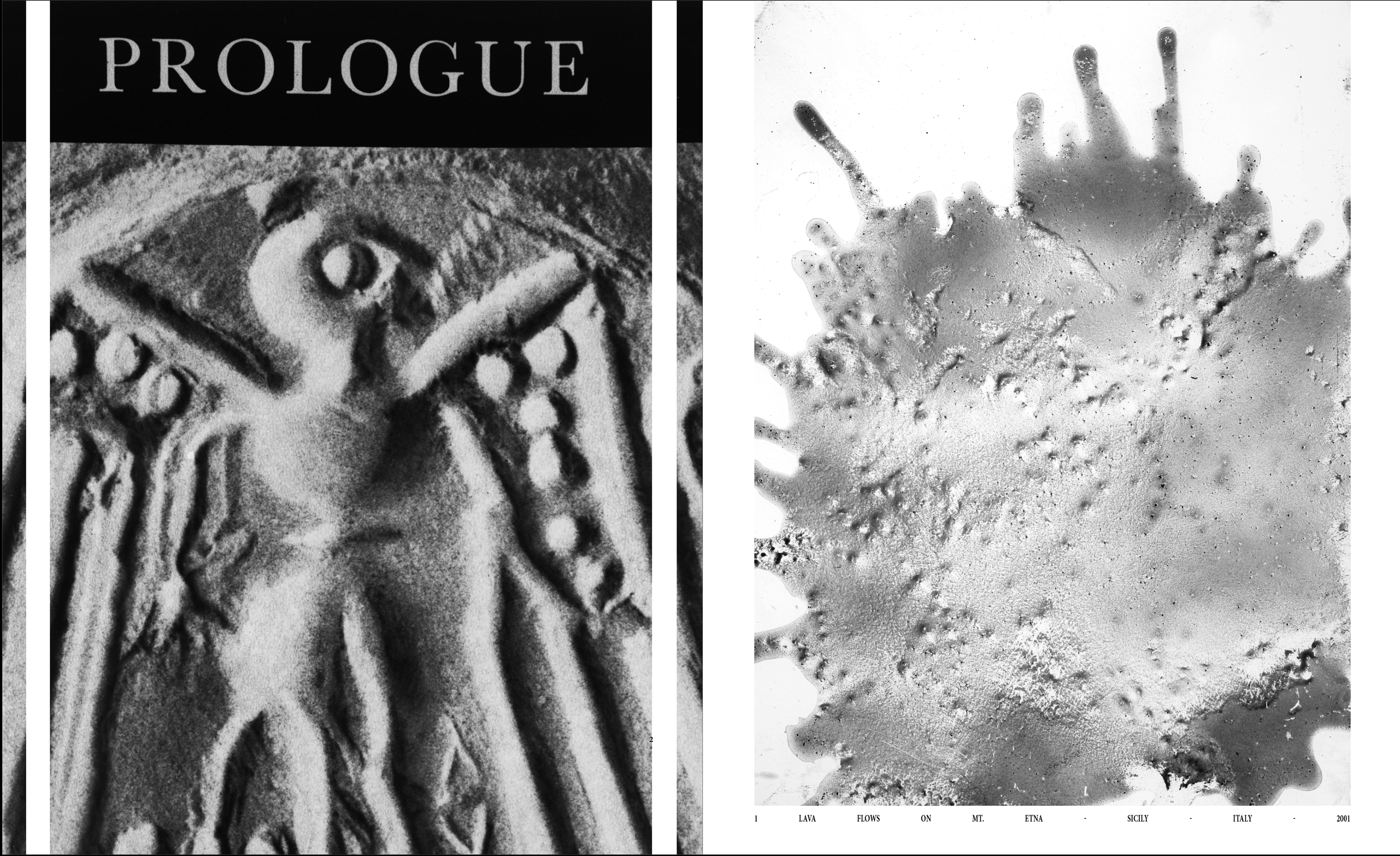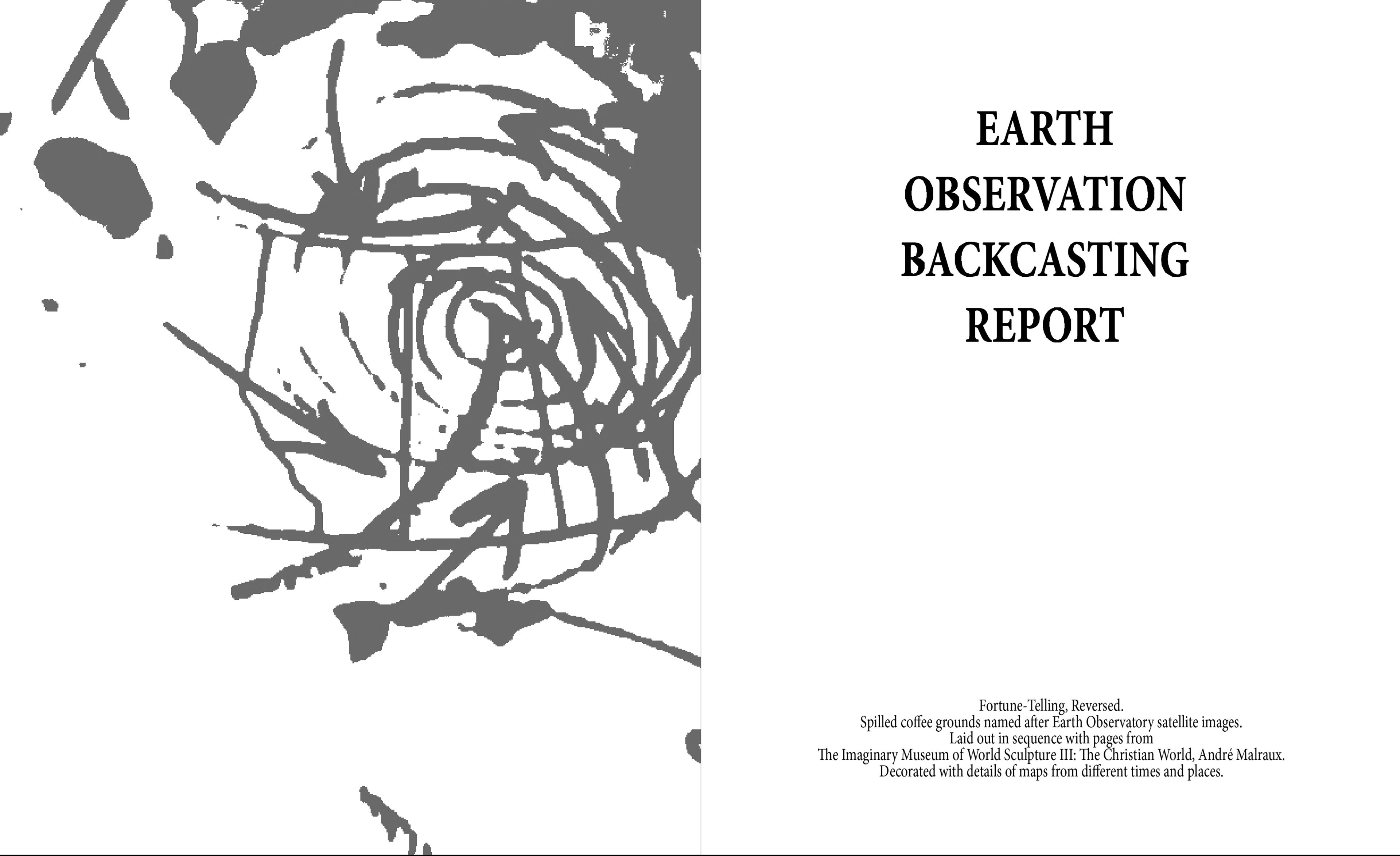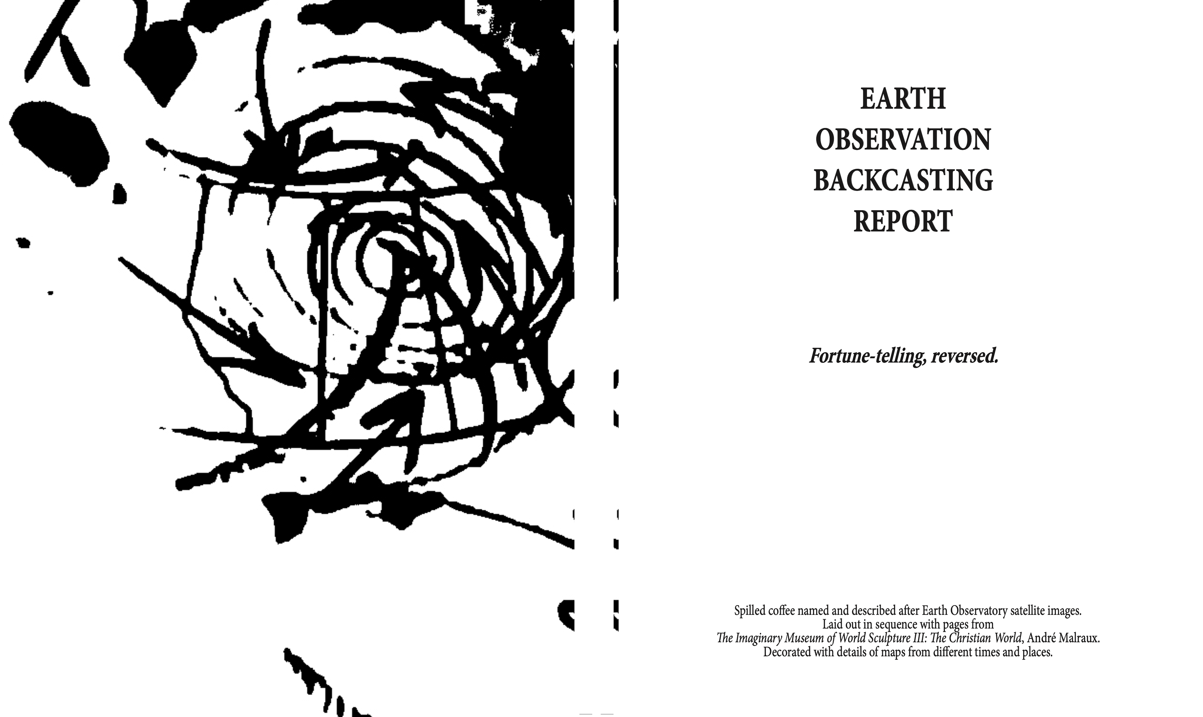 The book is structured as a speculative Earth observation backcasting report. Each double page pairs a photograph of spilled coffee stains with a rephotographed image from André Malraux’s The Imaginary Museum of World Sculpture III: The Christian World. Selected pages are further overlaid with fragments of maps from different times and places used as graphic residues rather than as navigational tools.