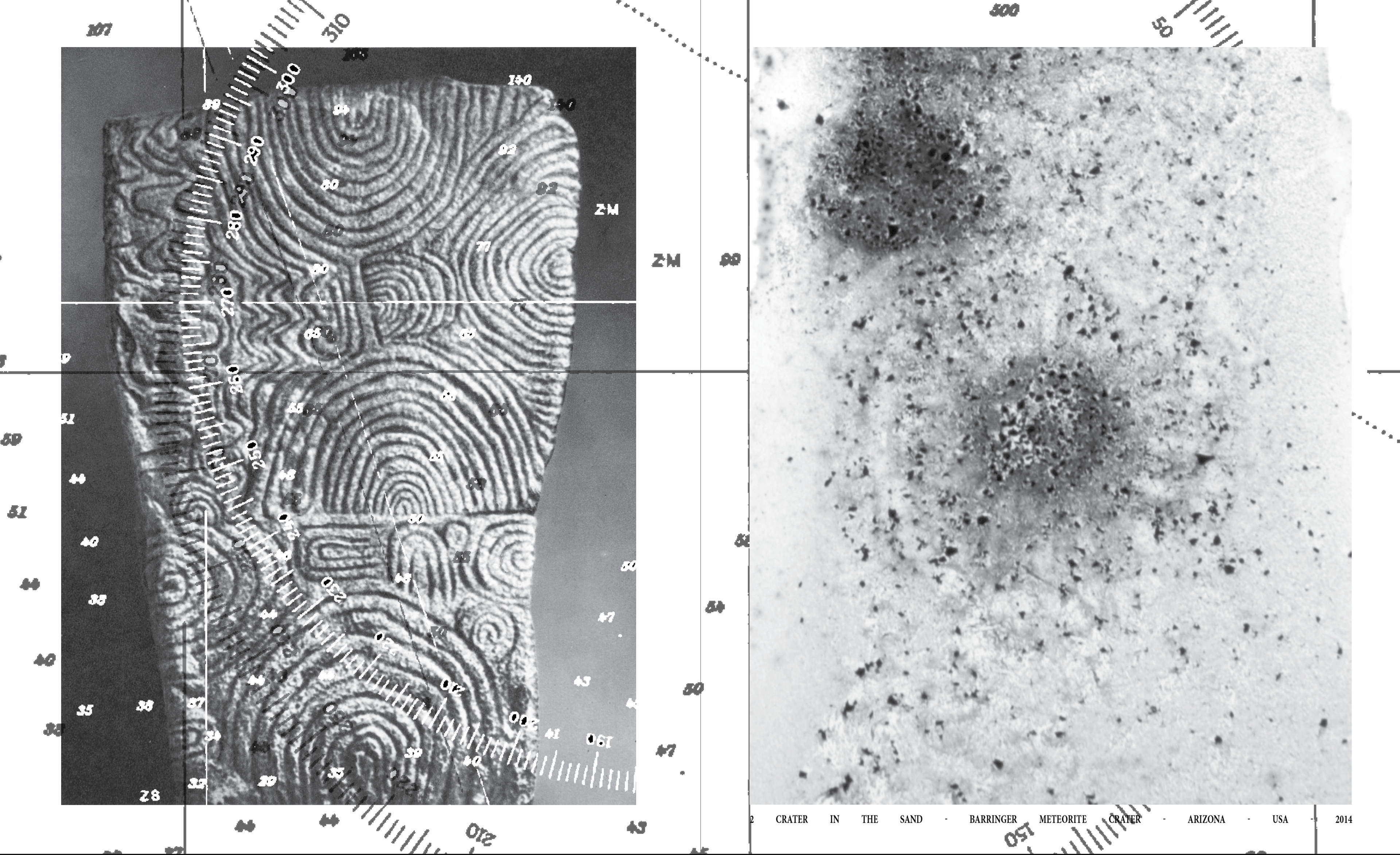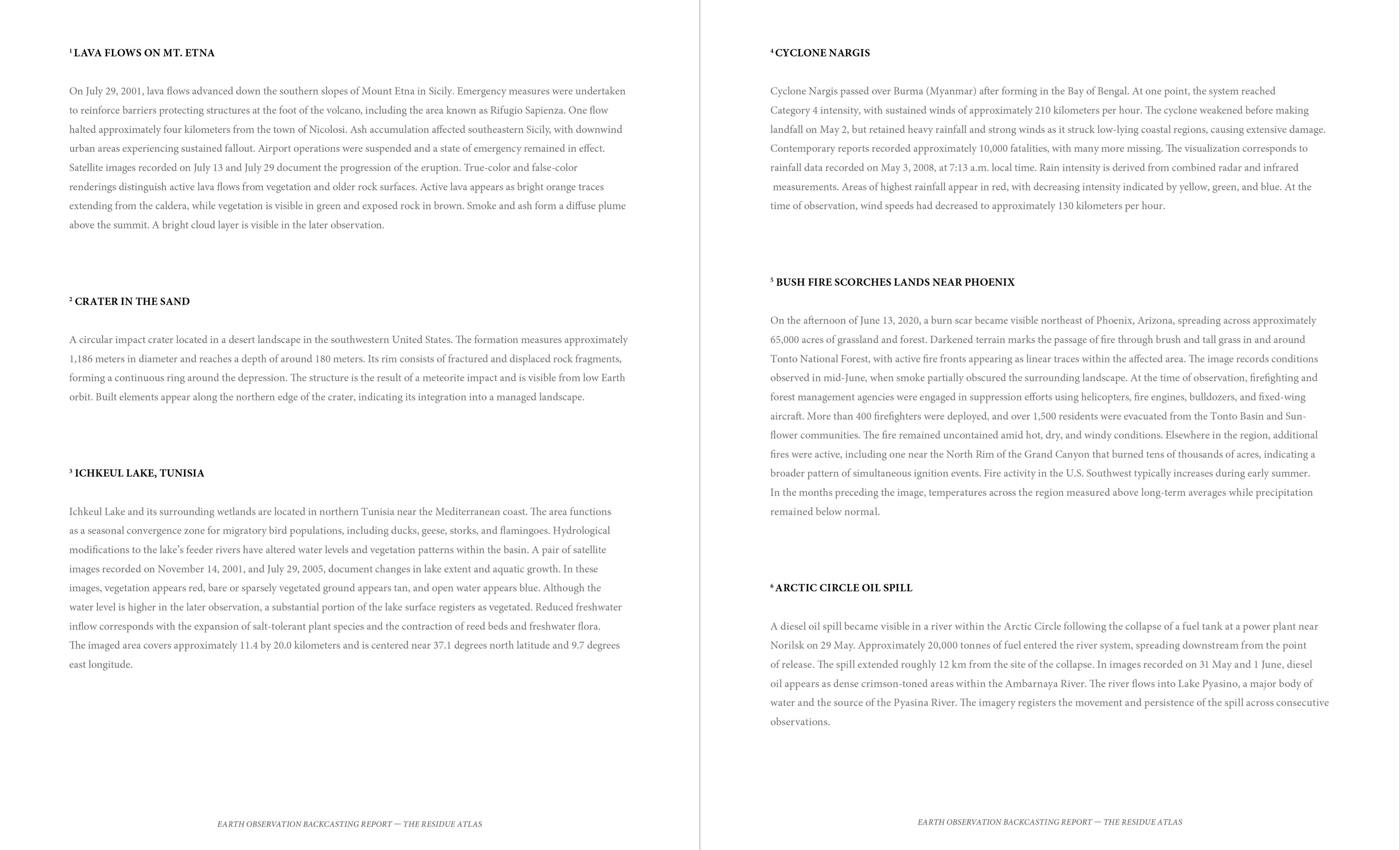 Each coffee stain is named after a visually corresponding Earth observation image documenting natural disasters, climate-related transformations, or sites of resource exploitation. These references draw from satellite imagery that records the material consequences of global warming and environmental degradation. Accompanying texts describe the observed surface phenomena.