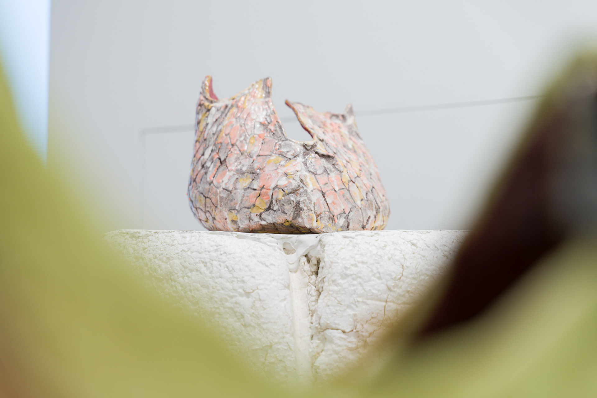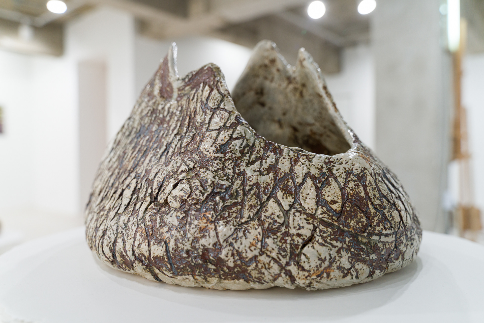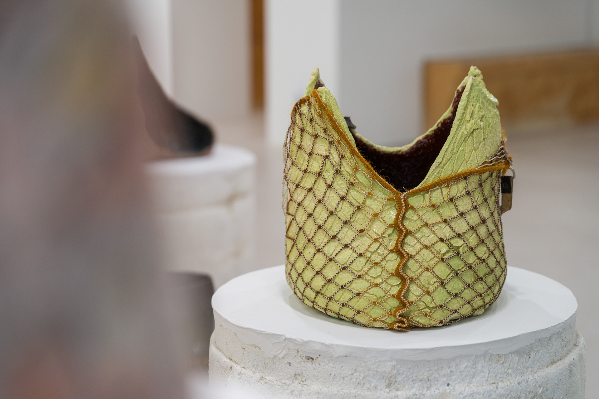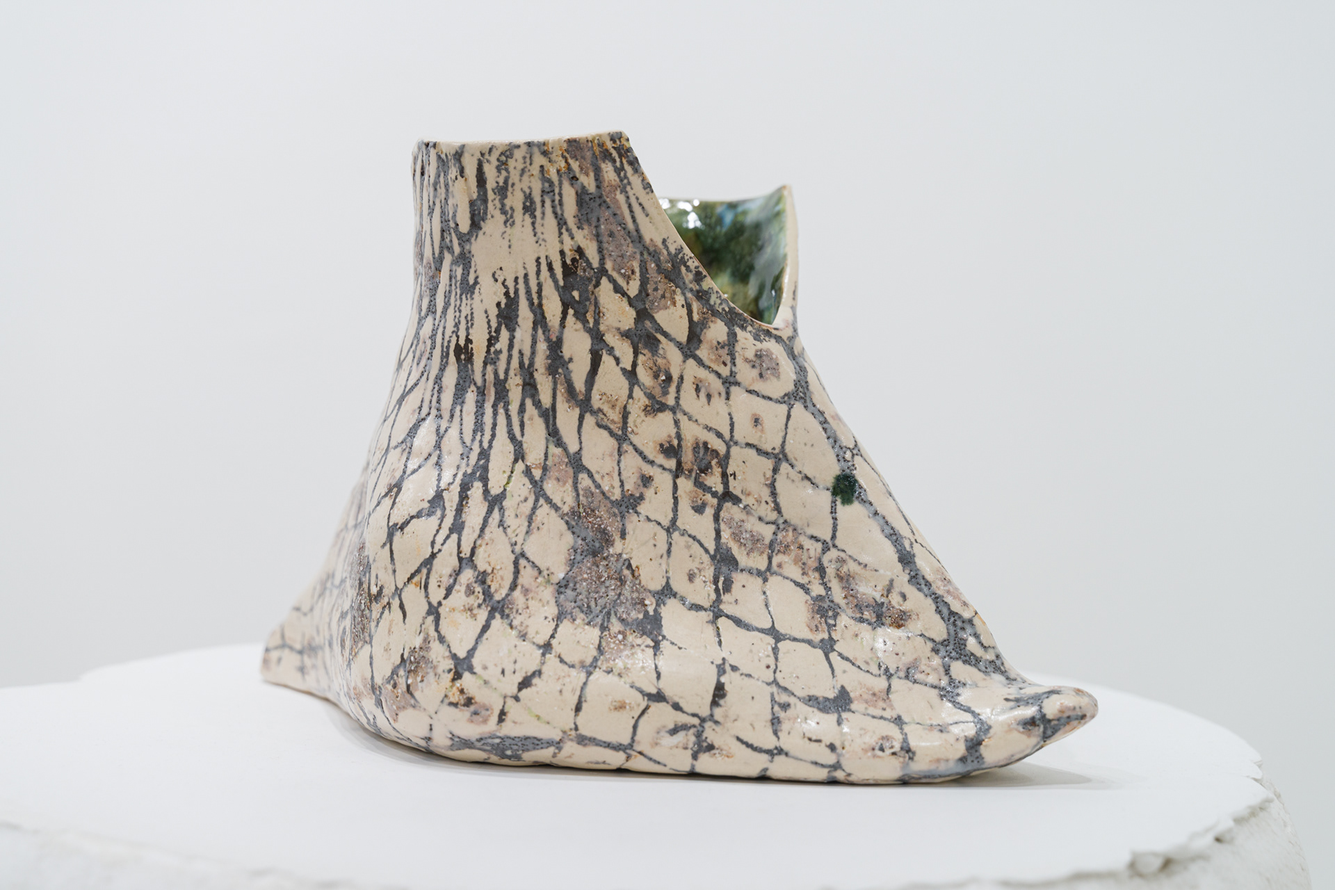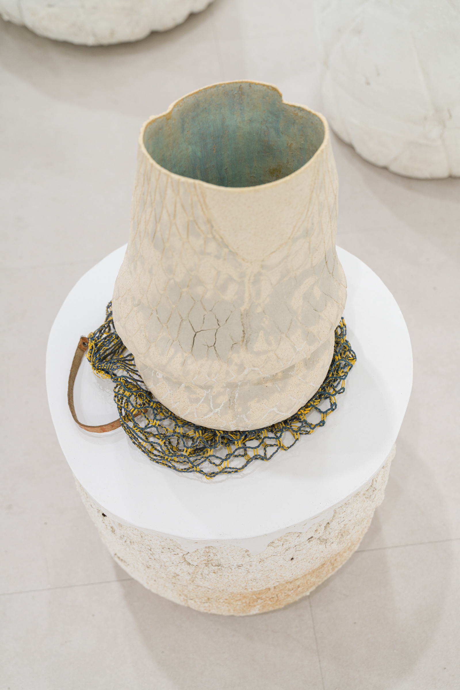 I Packed My Bag explores everyday objects as vessels of memory, transformation, and cultural residue. Ceramic forms are cast using former East German mesh shopping bags as molds, leaving fossil-like grid impressions on their surfaces. These fragile, oversized forms recall utilitarian containers, ocean creatures, or at times fashion accessories—suspended between adornment and function—and some remain wrapped in original mesh, merging object and support.