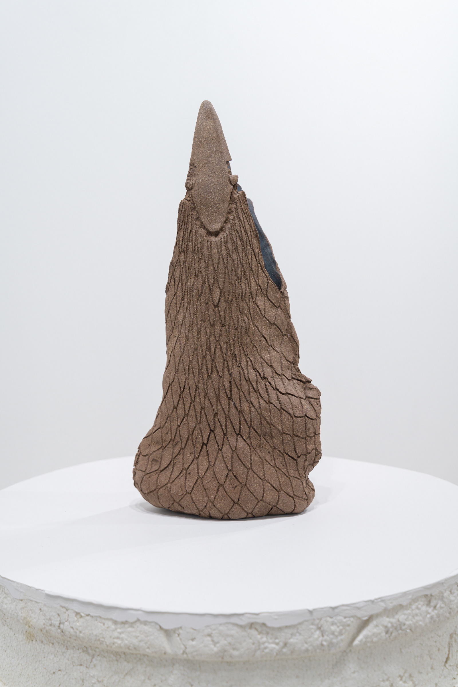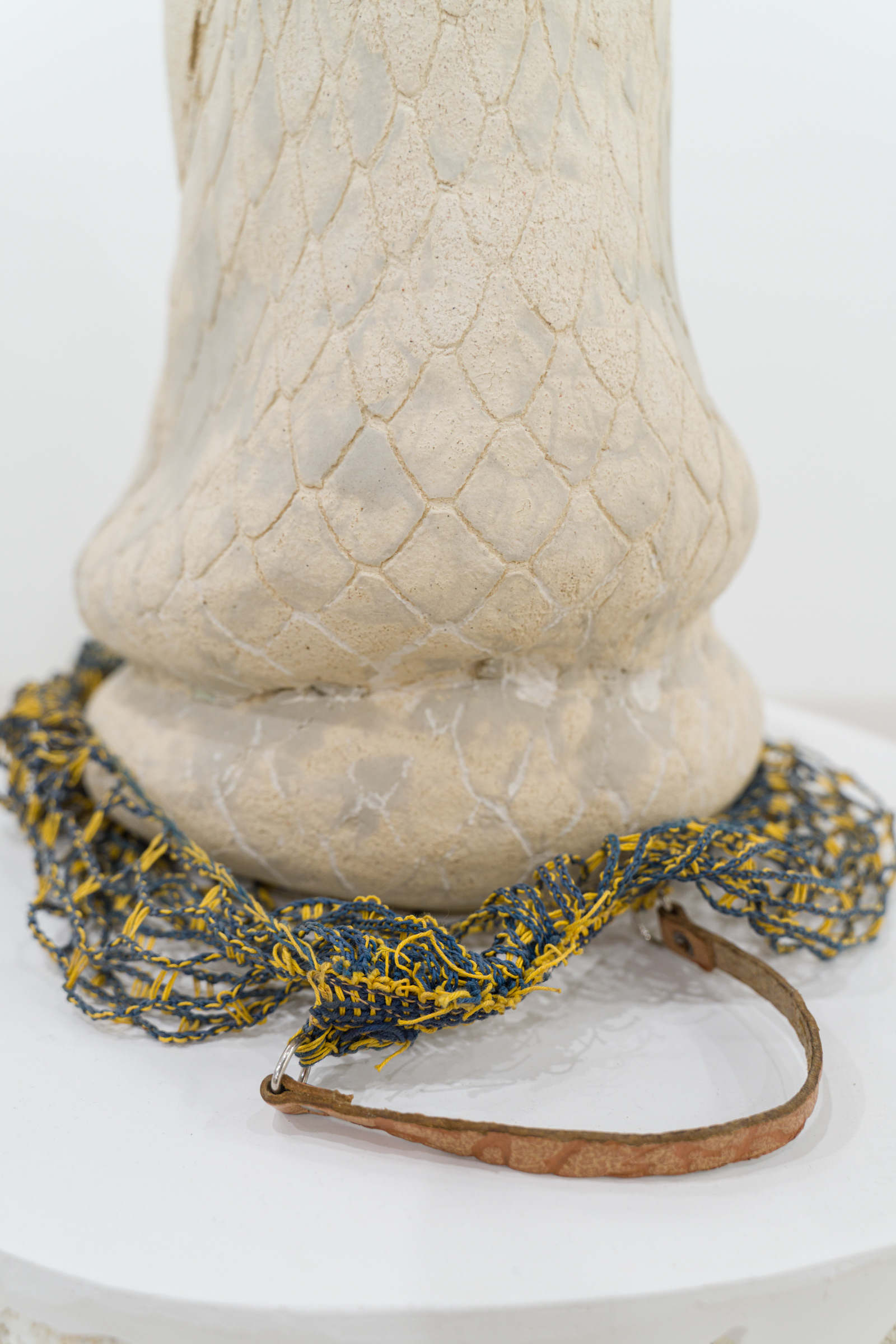 For the exhibition, the ceramics are displayed atop repurposed styrofoam fishing buoys, salvaged from the coastlines of South Korea. These buoys, scarred by the marks of fishing lines, echo the imprint left by the mesh on the ceramics. Together, they create a shared visual language—a textured cohesion that links land and sea, handcraft and industry, presence and absence.