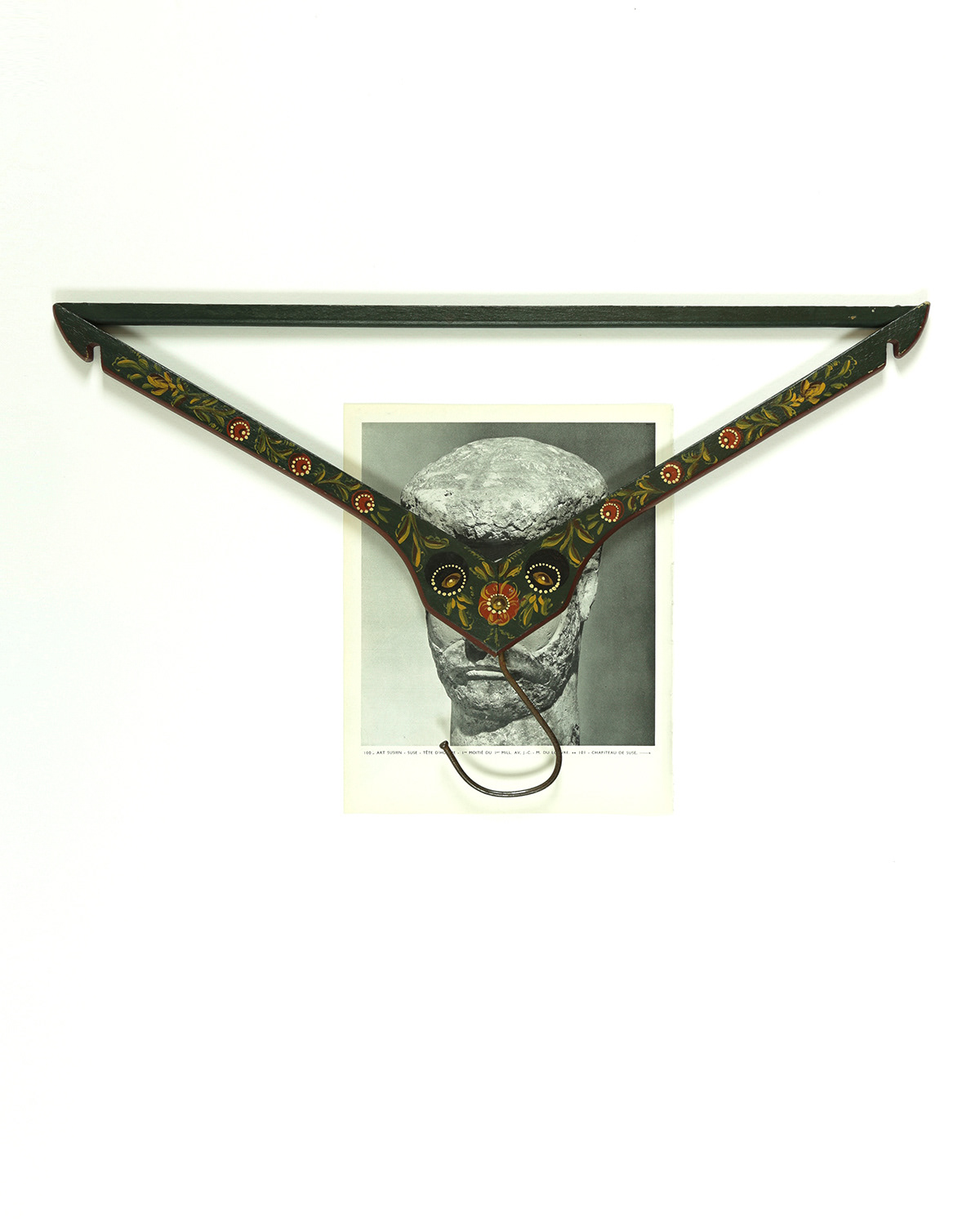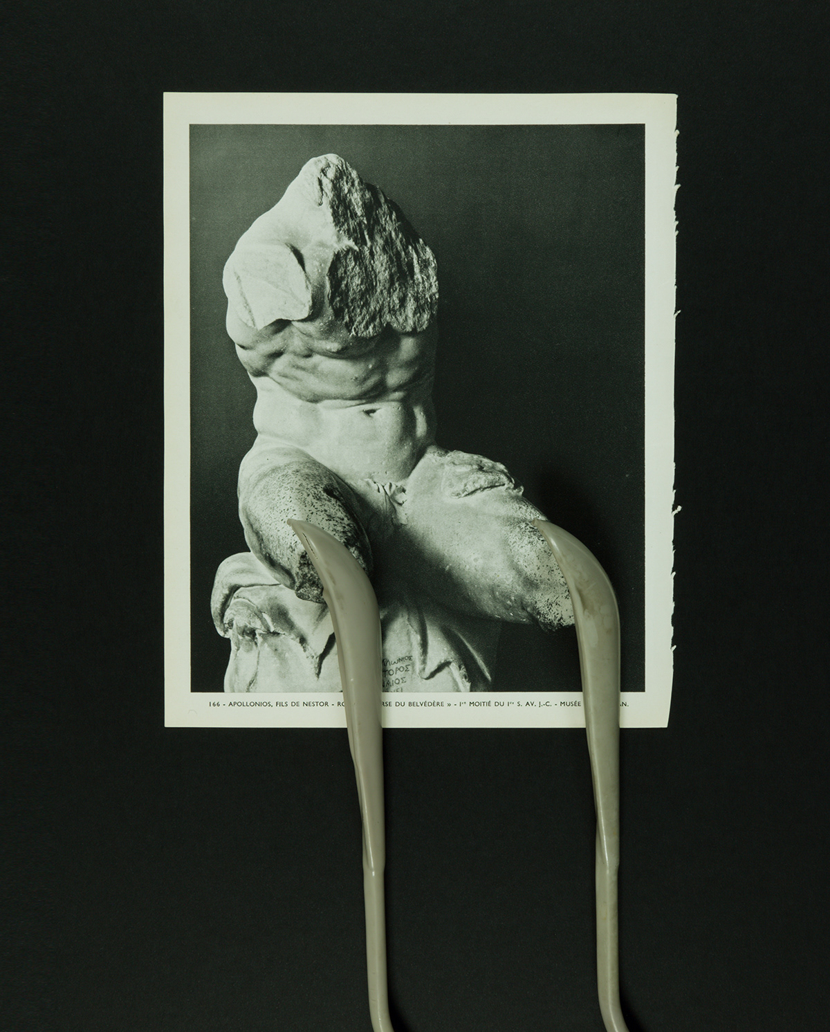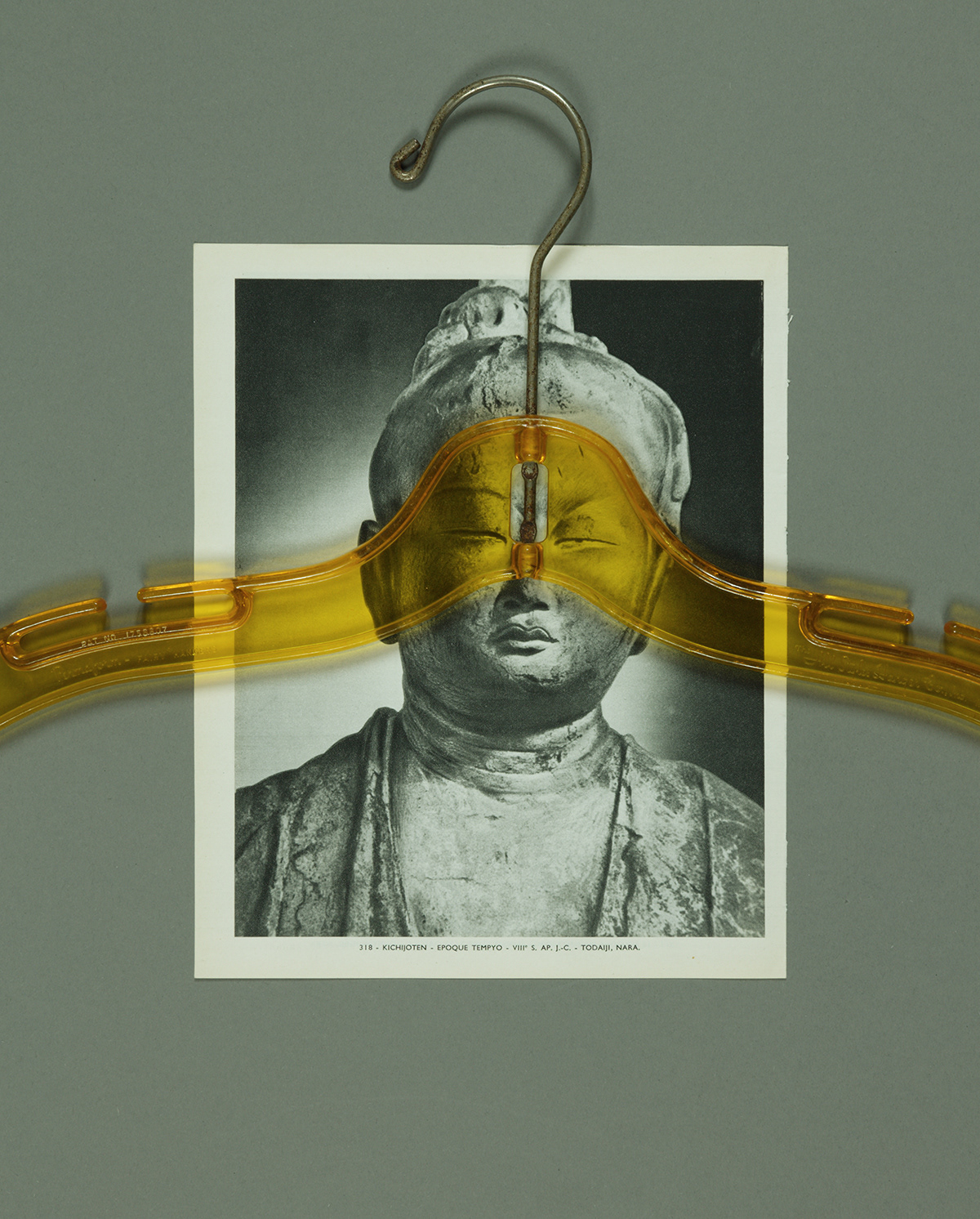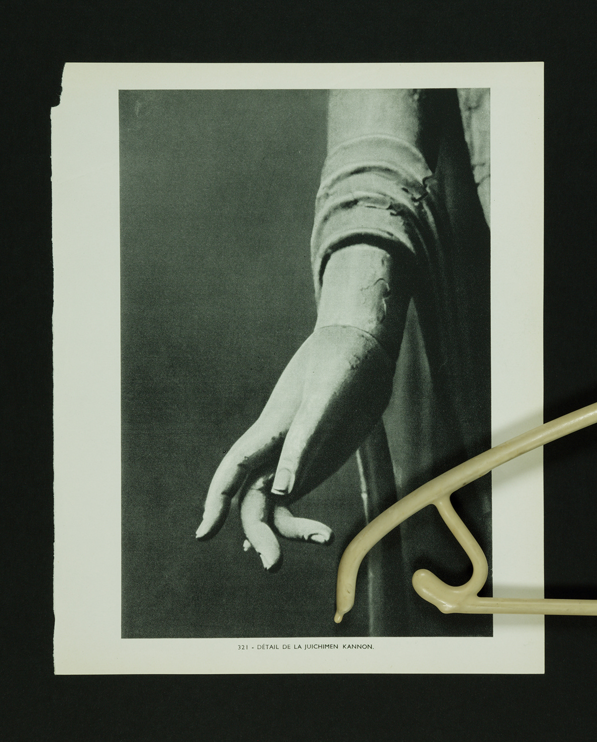 In the photo series Attachments, cloth hangers from my private collection meet ripped pages from André Malraux's Le Musée Imaginaire de la Sculpture Mondiale (1952). This classic organizes universal resemblances across centuries through Western perspective. Here, black-and-white photographs of an imaginary museum encounter colorful domestic objects from my closets.