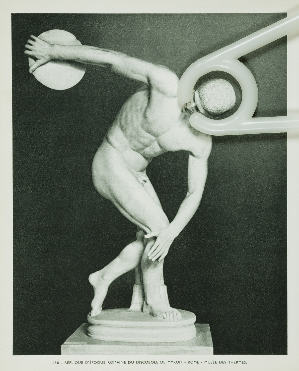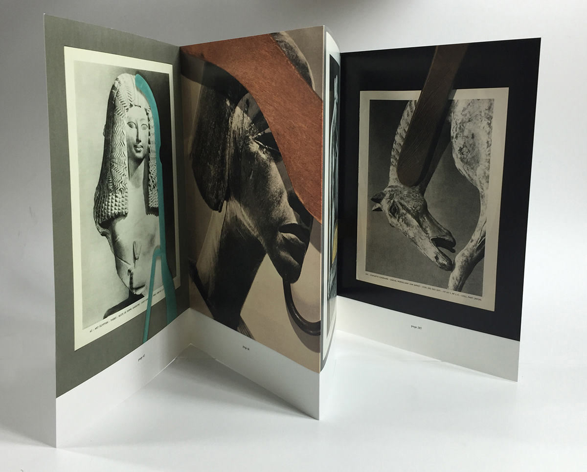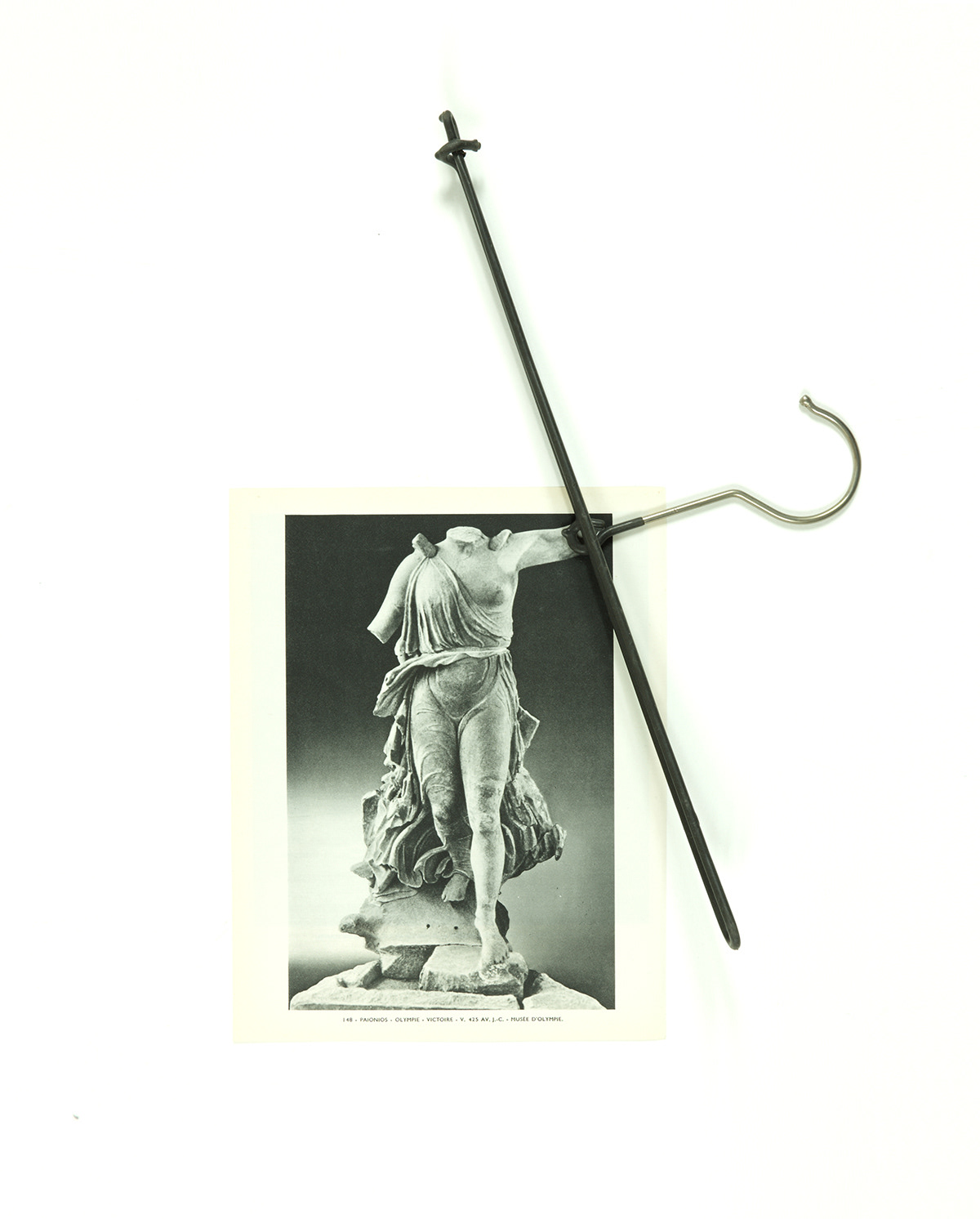 In the photo series Attachments, cloth hangers from my private collection meet ripped pages from André Malraux's Le Musée Imaginaire de la Sculpture Mondiale (1952). This classic organizes universal resemblances across centuries through Western perspective. Here, black-and-white photographs of an imaginary museum encounter colorful domestic objects from my closets.