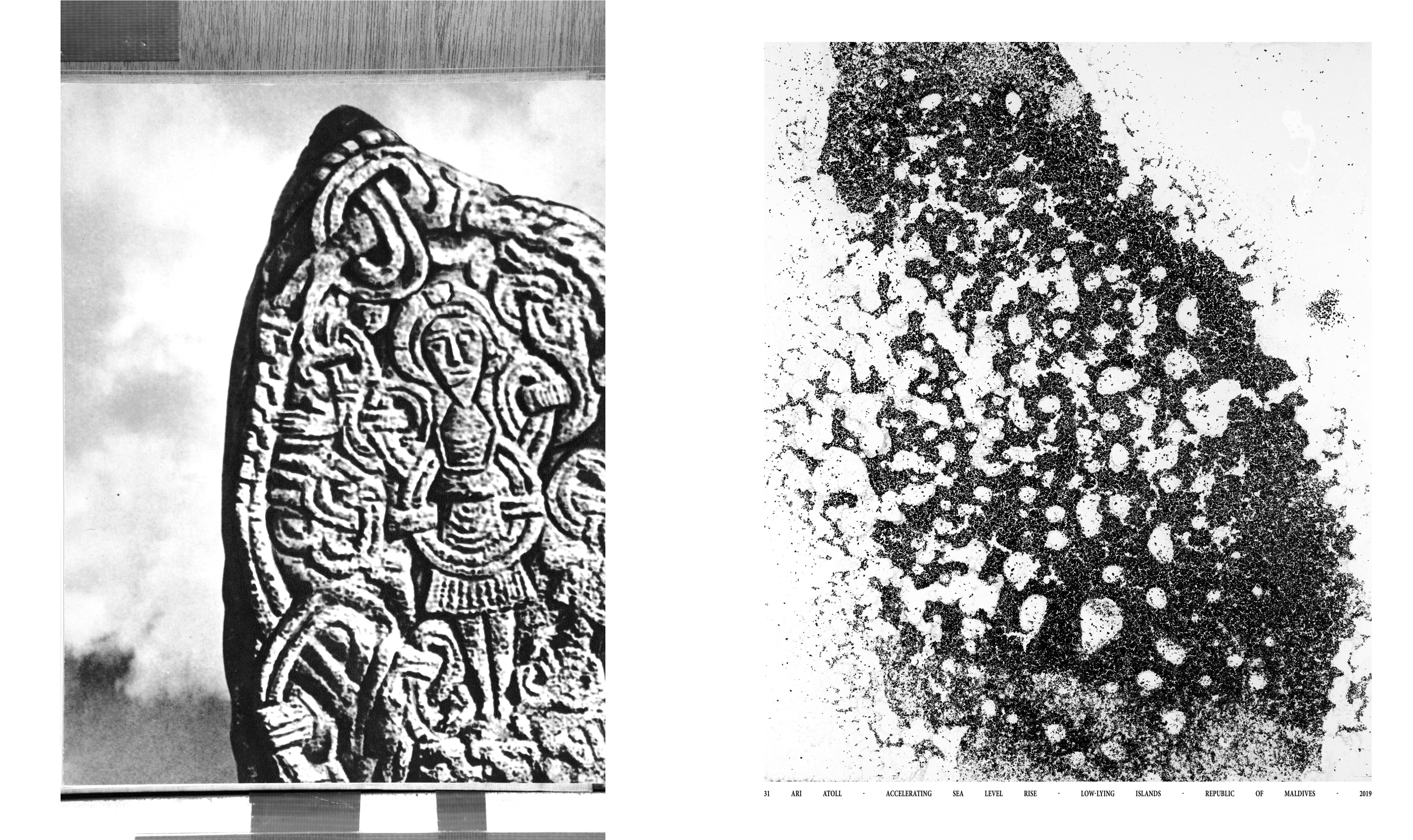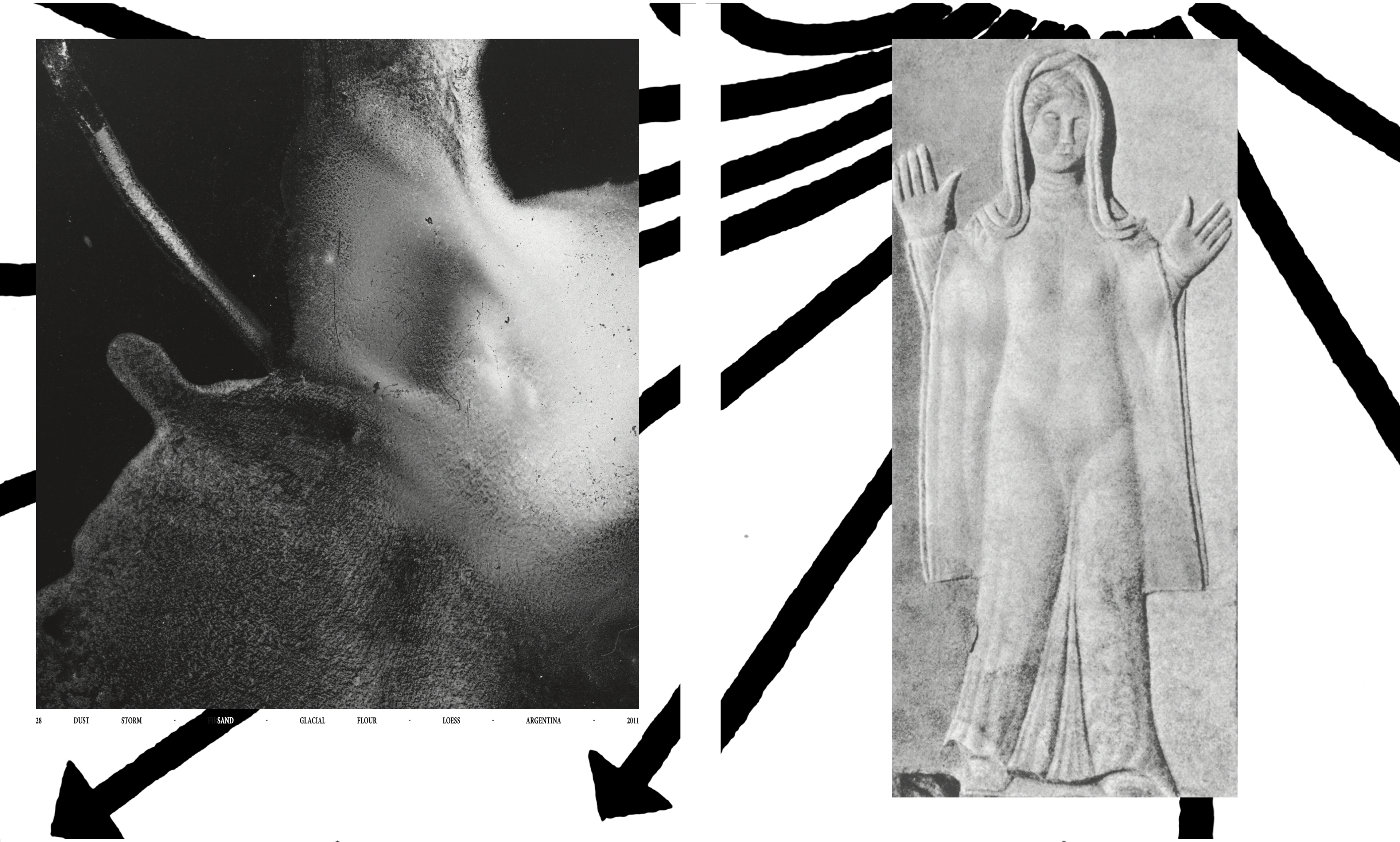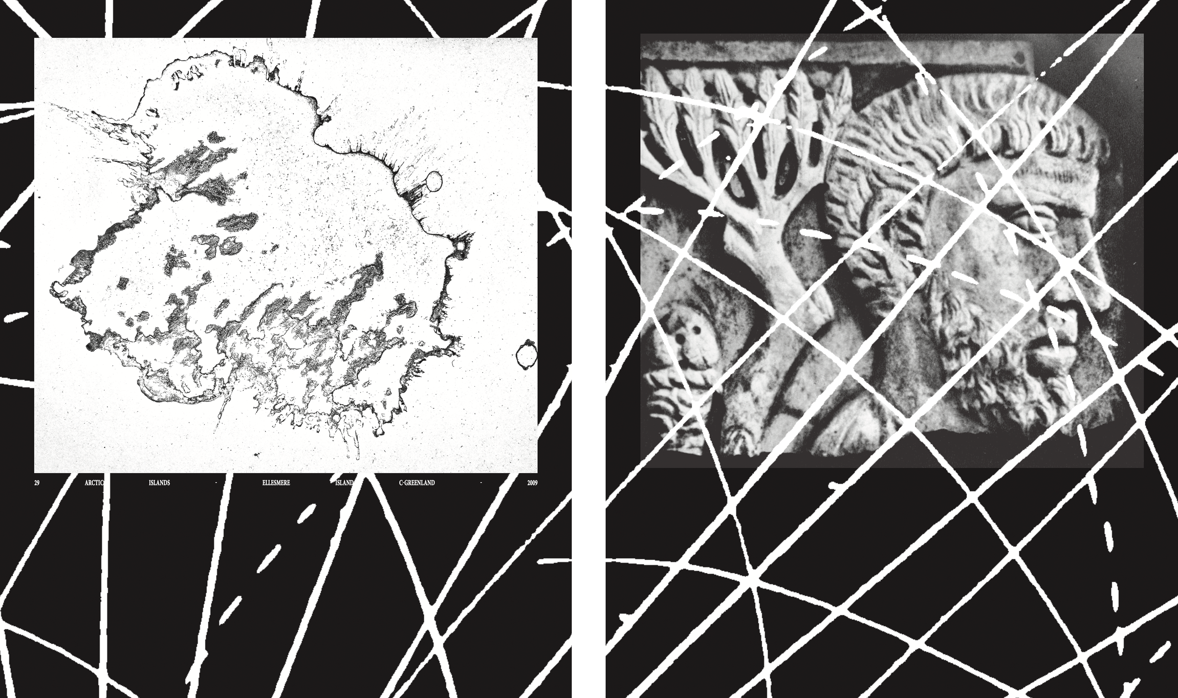 A speculative Earth-observation backcasting report, the book pairs coffee-stain photographs with rephotographed images from The Imaginary Museum of World Sculpture III, sometimes overlaid with map fragments.