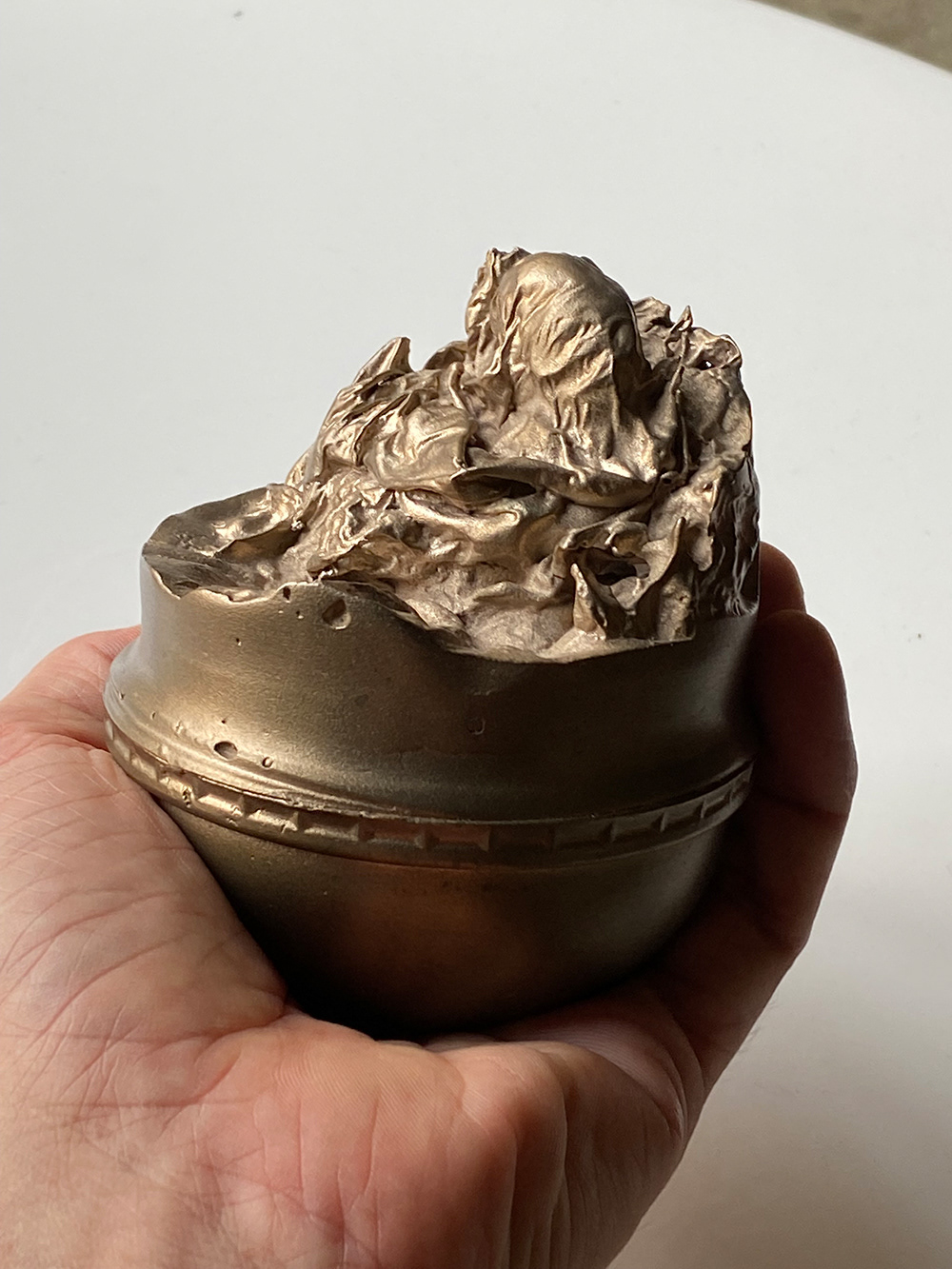 Bronze casts of iced coffee lids and wax poured into cold coffee form a kind of global cruciger.