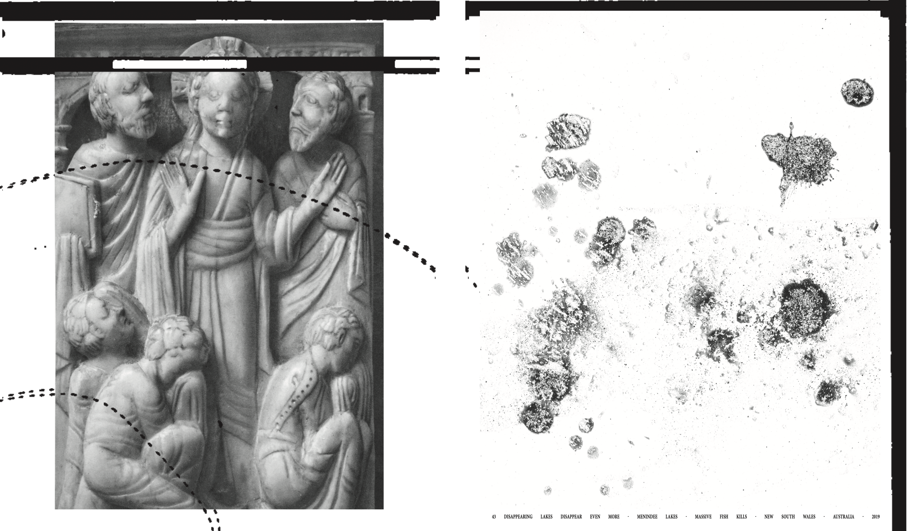 IN THIS LE MUSÉE IMAGINAIRE WORK, COFFEE STAINS NAMED AFTER SATELLITE‑SEEN DISASTERS PAIR WITH MALRAUX’S PHOTOS FORMING AN EARTH OBSERVATION BACKCASTING REPORT THAT READS WASTE RESIDUES AS SIGNS OF CLIMATE DAMAGE.