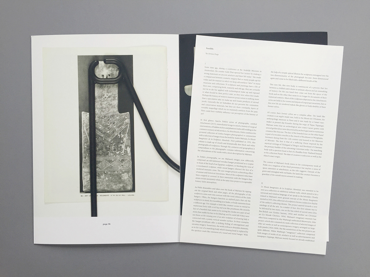 Hangers attach mimetically—imitating sculptural gestures, matching shapes, extending bodily over page edges, or prosthetically commenting on, adapting, and repairing damaged forms. Attachments describes both physical connection and emotional bonds to objects. "Malraux's universal language fragments when viewed through one's uncanny closet interior," notes Arnisa Zeqo (Facelifts).