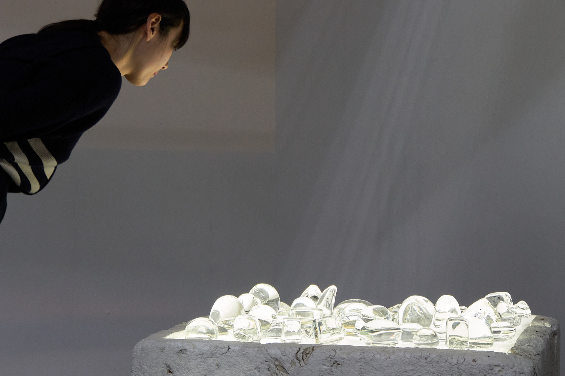 Liquid Grounds serves as a poetic document on our unstable foundations amid economic and social challenges. Displayed on a large rectangular styrofoam buoy transformed into a lightbox, the objects amplify their ethereal presence and tie land to water—resembling sea creatures that journeyed from Amsterdam North to Seoul, evoking the area's shipbuilding heritage that thrived until 1984.
