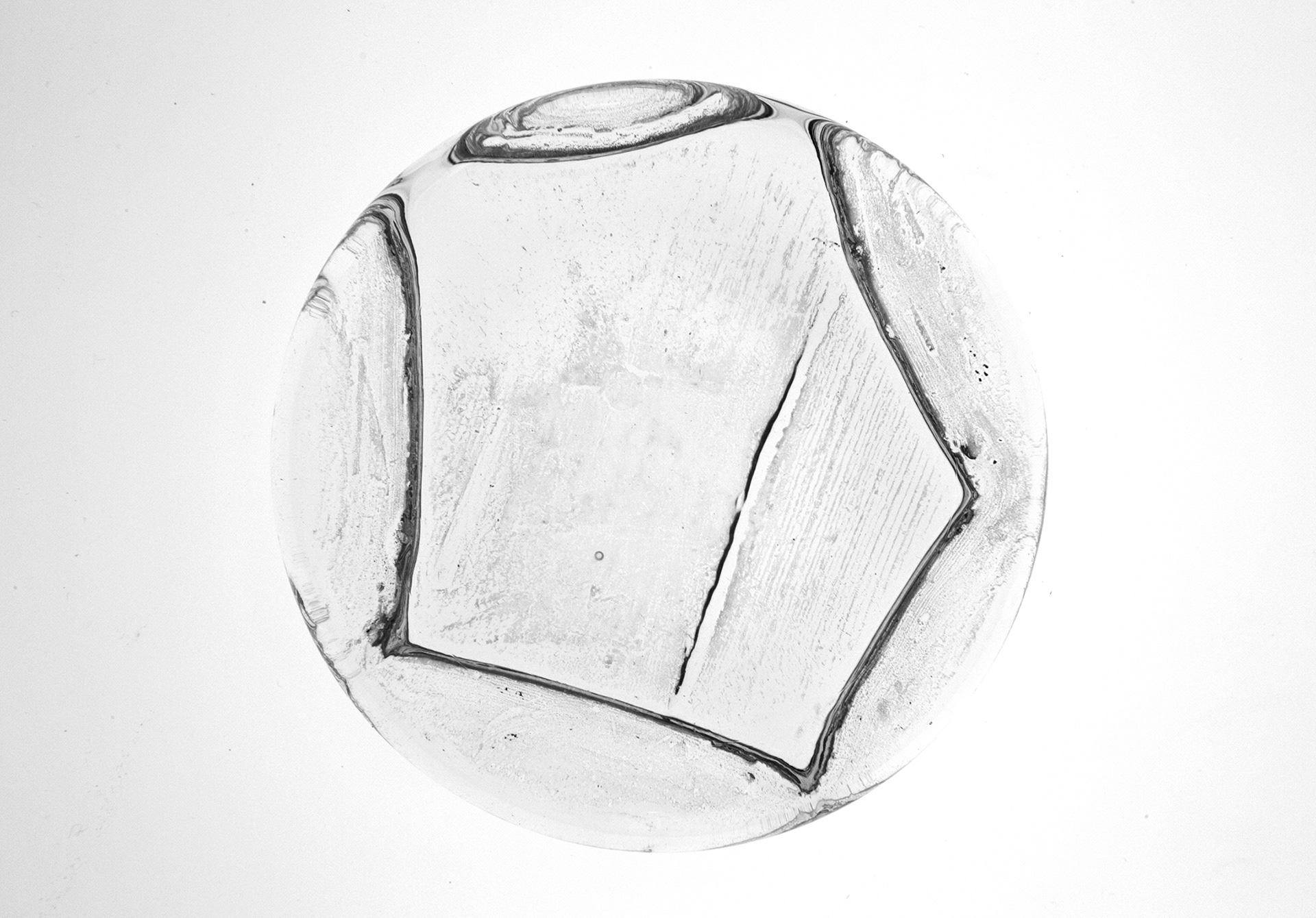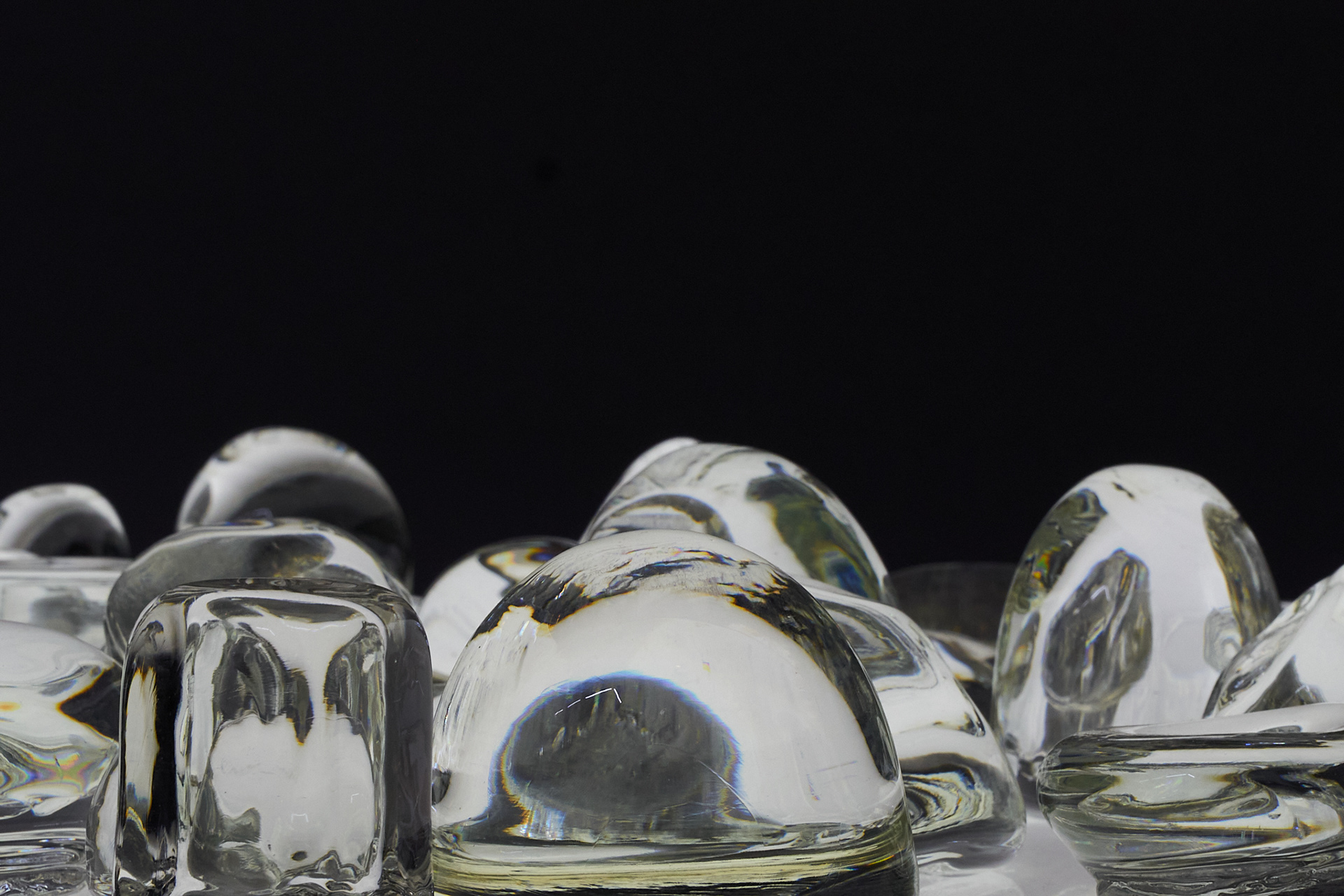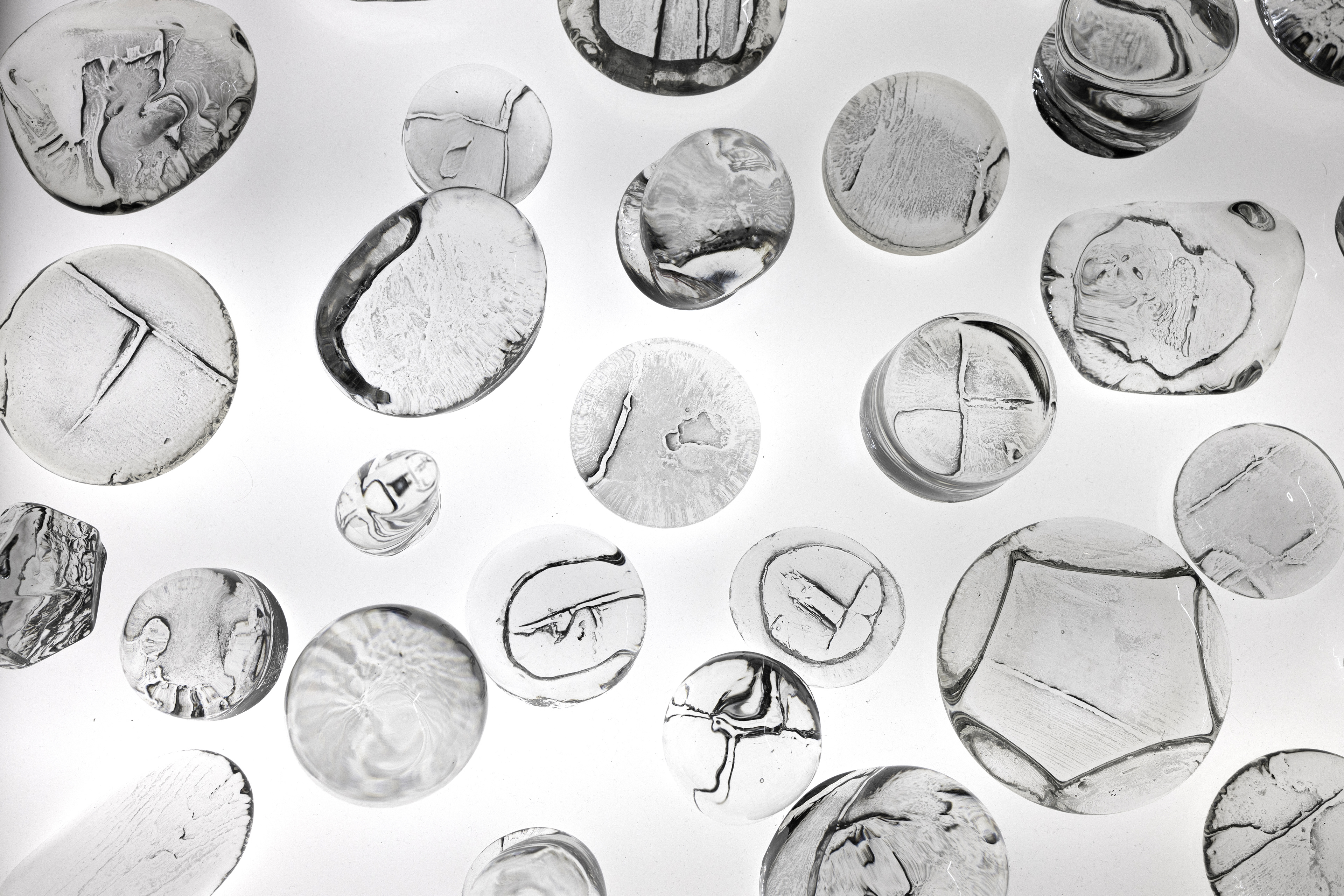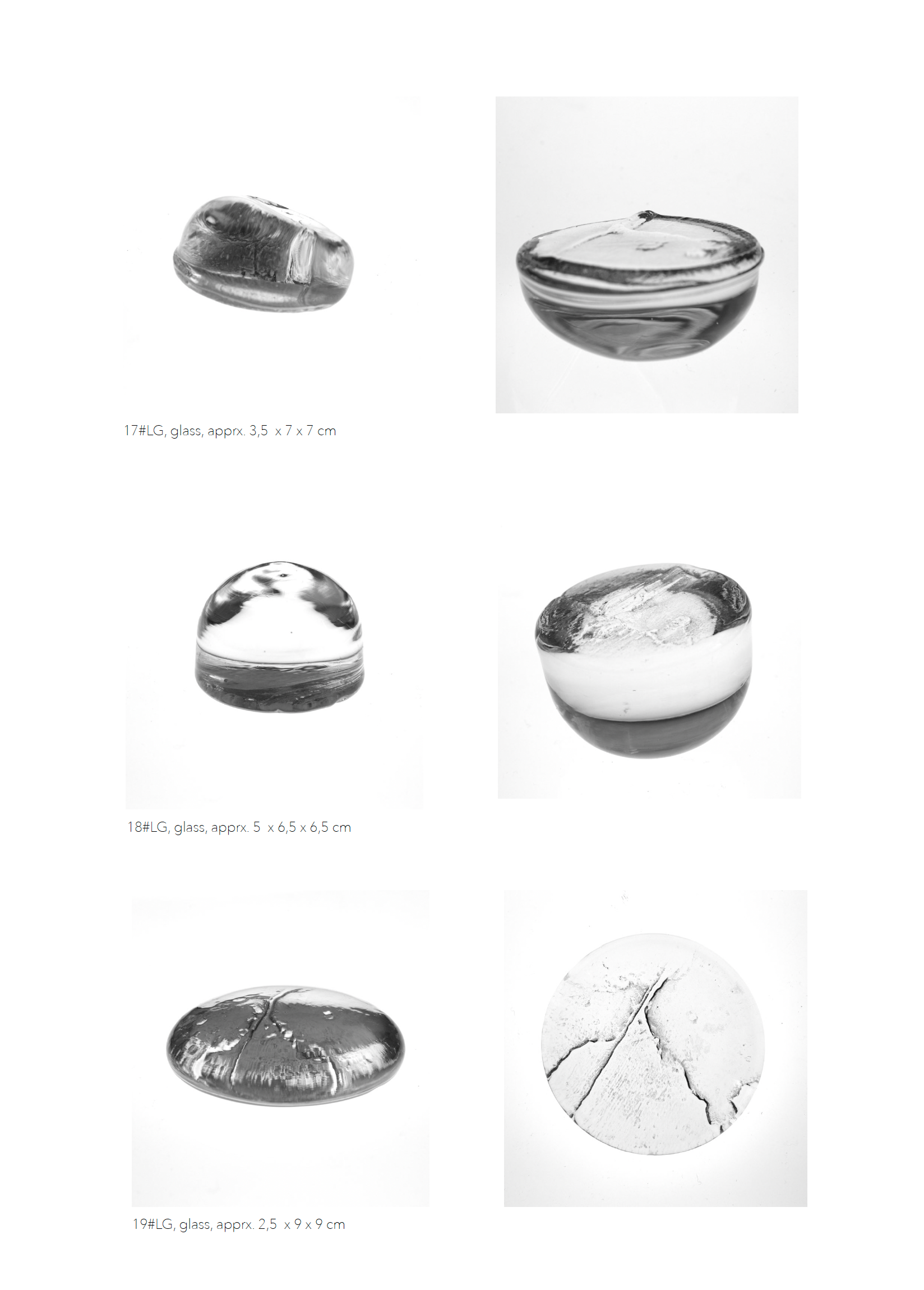 Liquid Grounds is a multidisciplinary artwork of glass objects and a silent video film. It offers a micro-perspective on belonging and dwelling, rooted in the notion of "ground." The glass objects are cast from sections of an old wooden floor from my former home in Amsterdam North—an area deeply shaped by gentrification. These vary in size with mostly round, organic shapes; when viewed like through a glass paperweight or camera lens, their undersides reveal fossil-like imprints of that domestic space, acting as a specimen case or miniature museum that encapsulates traces of life tied to place and time. In this way, the glass becomes both artifact and lens for observing its own history.