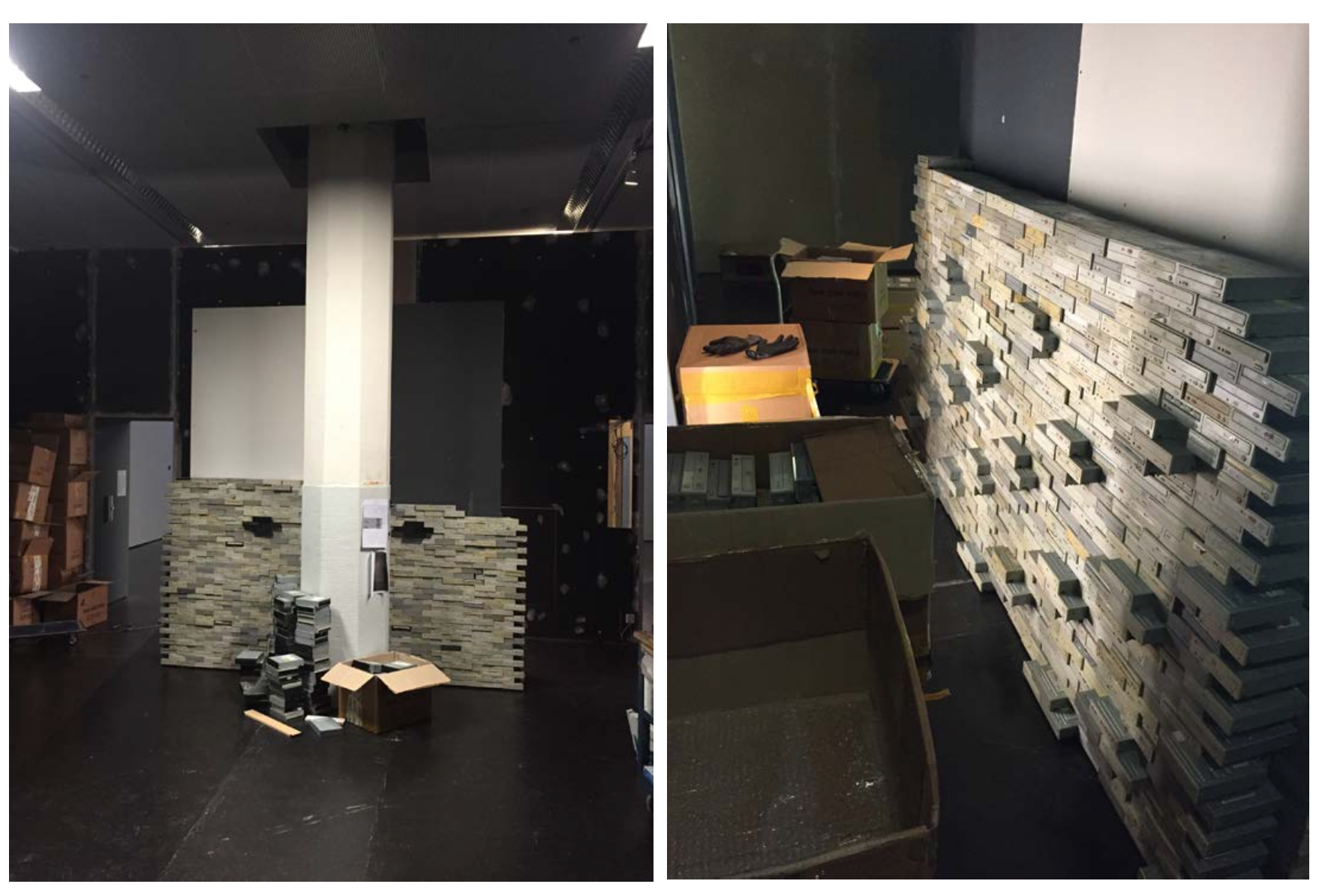 Each sequence of the 16 mm film depicts mural fragments built with hundreds of collected DVD/CD computer drives used as unitary bricks. In the context of the modern ruin discarded devices are staged as archaeological artifacts, fossil-like remainders, with and without patterns, which one might encounter wandering in a museum or excavation site.