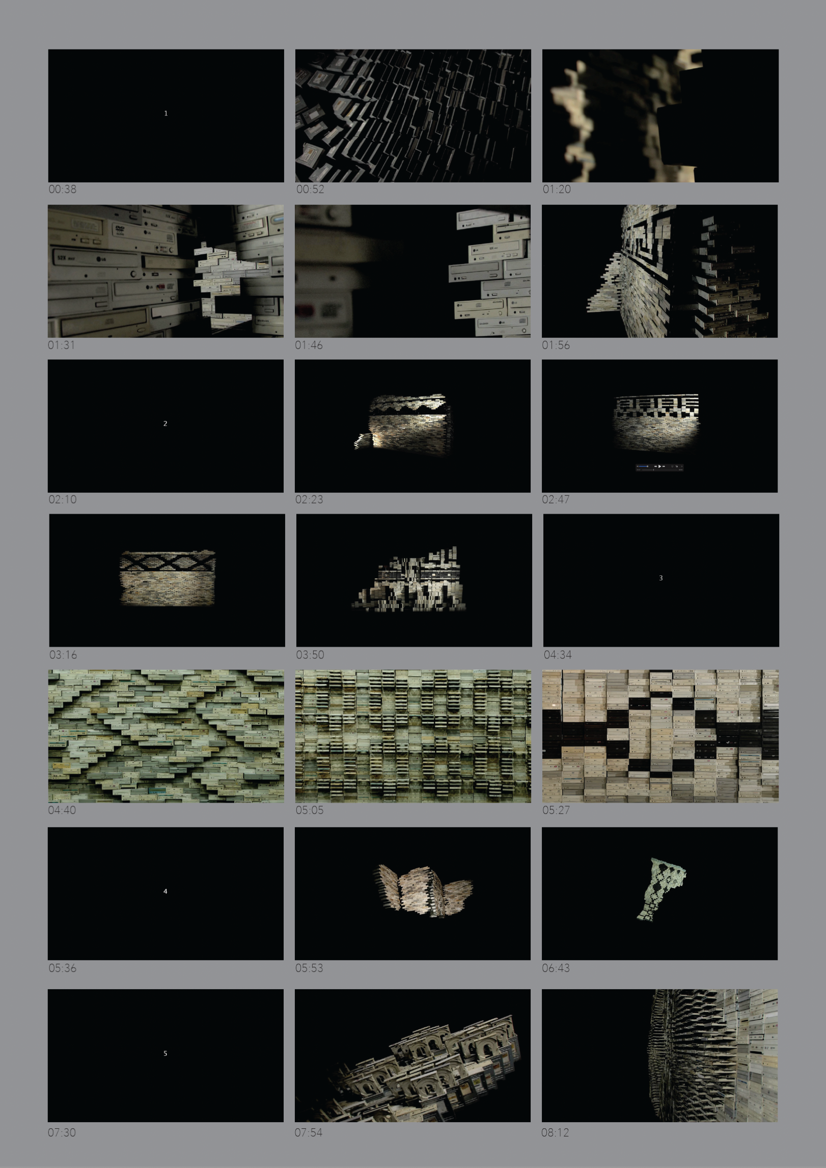 Ornaments of Property is a modular sculpture and 16mm film loop that explore discarded technology as both material and cultural artifact. The sculpture is composed of hundreds of collected DVD/CD drives used as unitary bricks, forming mural fragments that create mixed ornamental languages—stripped of original cultural or national genealogy through time, space, and artistic reinterpretation. These modern ruins transform the devices into archaeological artifacts: fossil-like remnants encountered in museums or excavation sites, with emptied containers revealing how memories contain and are contained. Digital archiving technology itself becomes a cultural object where fact and fiction merge into new architectures.