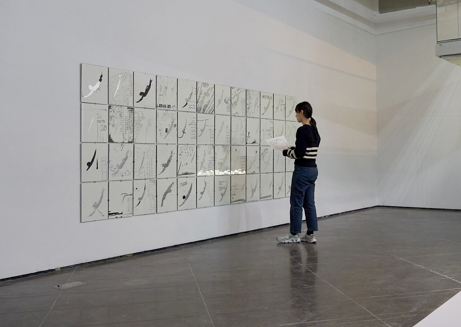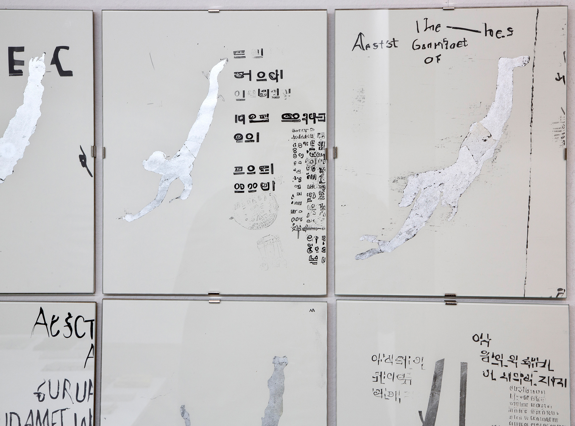 Regardless of Nationality explores nationality's fluidity, playing with how migration transforms countries and migrants alike—echoing the symbolic dive from Paestum's Tomb of the Diver (c. 470 BCE), where a lone figure leaps from solid ground into water. An antique-futuristic mural of framed laser prints with silver leaf decoration—evoking kintsugi repair of broken ceramics—features maps and divers on varied backgrounds, overlaid with scrawls in fictitious Latin and Korean-like alphabets plus ambiguous contract stamps.