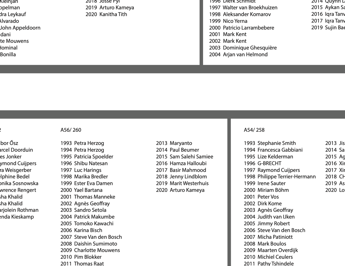 Studio Index is a historical overview of every artist who worked in the Rijksakademie van beeldende Kunsten, Amsterdam, since 1993. Registered on the building's floor plan, each artist's name appears by year and studio location used during their two-year residency.