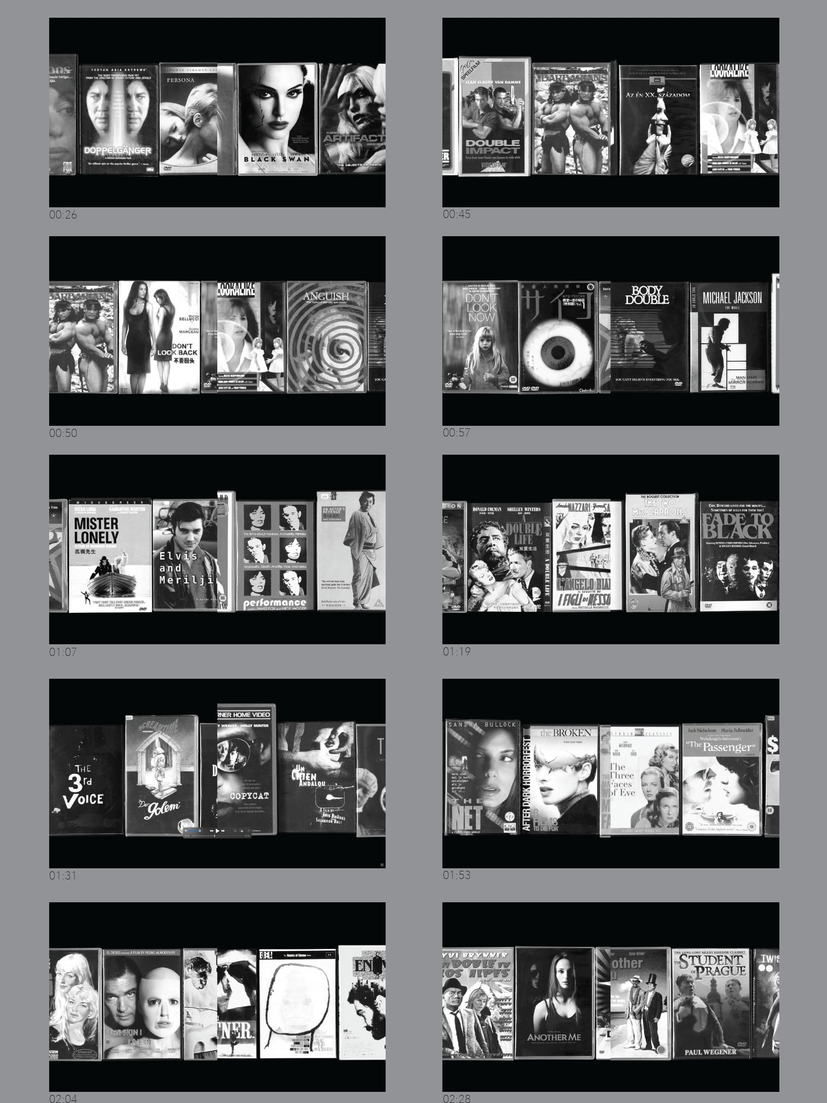 The video SPLIT features two rows of VHS and DVD covers from the ‚Doppelgänger Video Archive‘, overlapping in the middle as a vertical cut, creating a tension between simultaneity and division—a play with mirroring and doubling.