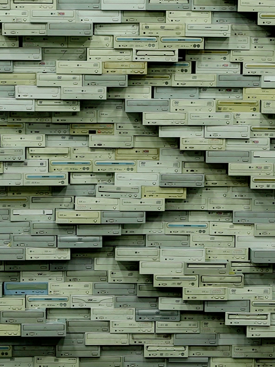 This five‑chapter film reanimates discarded DVD/CD drives as fossil‑bricks in imagined architectures. Analog cinematography turns digital waste into luminous ruins drifting through cosmic black.