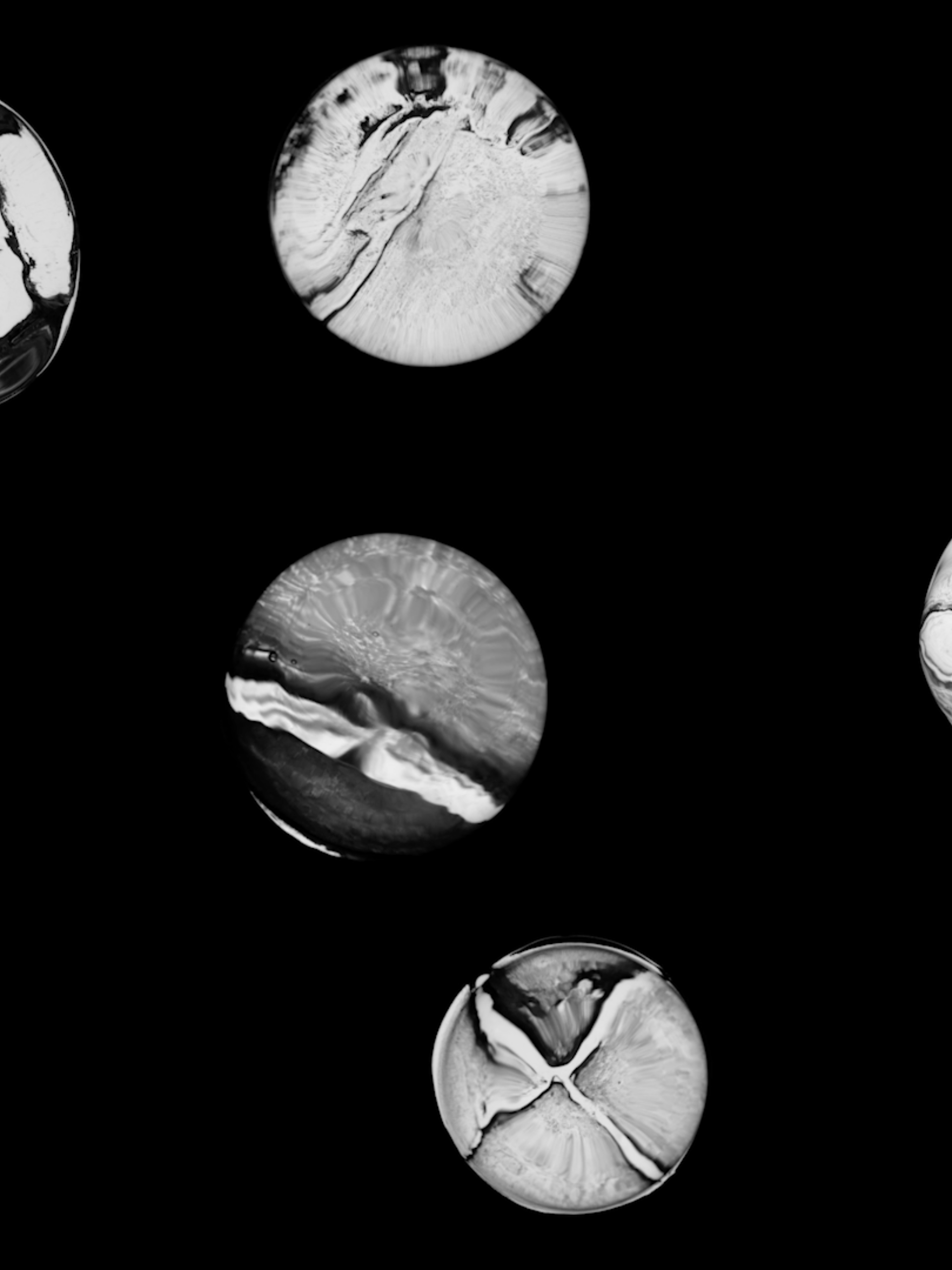 The video reanimates floor casts as luminous micro‑worlds—cells, bacteria, or planets—shifting domestic remnants into abstract, drifting life.