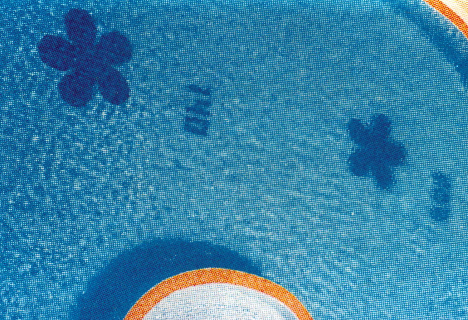 The work “Pool und Glück” consists of different collected images from travel brochures with pool shapes looking like cloverleaves.